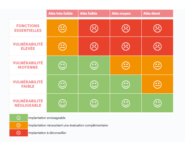 Matrice aléa/vulnérabilité : adéquation des implantations selon les niveaux d’aléa et de vulnérabilité. © Référentiel « Constructions et aménagements en zone inondable