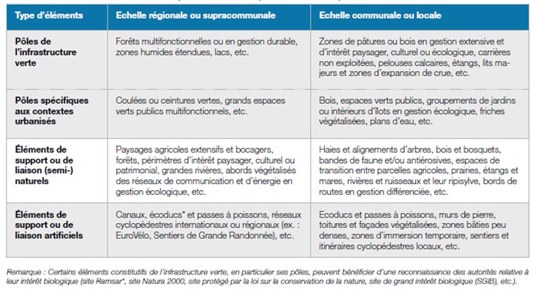 Dans la structure territoriale, l’infrastructure verte peut s’appuyer sur des éléments naturels, semi-naturels ou artificiels, identifiés en tant que pôles, liaisons et supports de l’infrastructure verte.