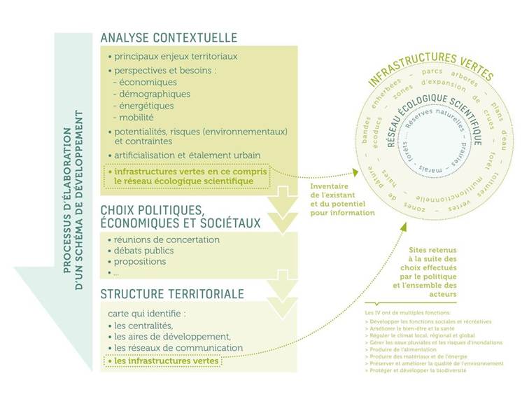 Ce diagnostic doit se faire dans une approche multi-échelles : « Il est essentiel de tenir compte des caractéristiques des territoires limitrophes et de mobiliser les outils ou schémas définis à des échelles de territoire supérieures. Une infrastructure verte efficace s’appuiera généralement sur un réseau dense et étendu d’éléments (semi-)naturels. Une commune au capital naturel limité devra idéalement s’appuyer sur des zones de production de services écosystémiques localisés au-delà de ses limites territoriales. »5