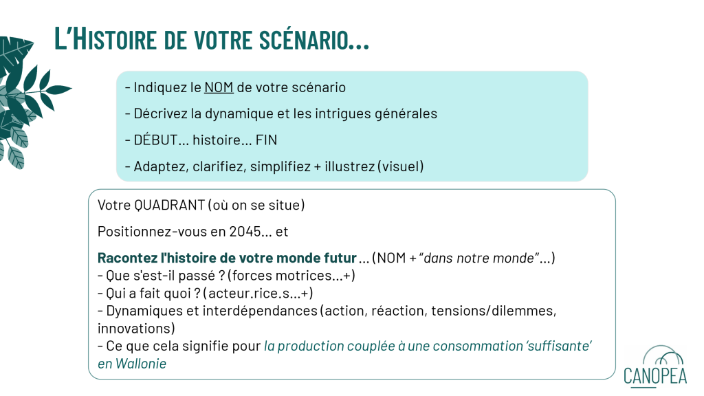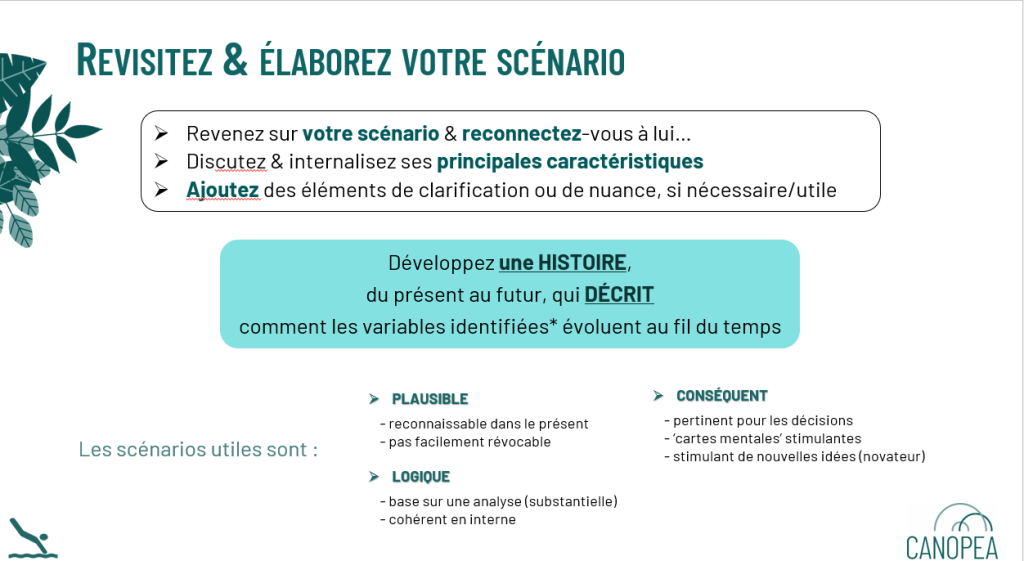 Avant de nous replonger dans le développement des scénarios, nous avons présenté des éléments de réponses aux questions que les participant.e.s se sont posées à la fin du 1er atelier :