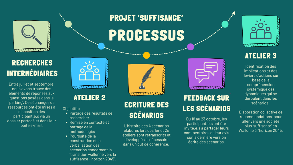 Lors du 2e atelier de la recherche collaborative sur la suffisance, qui a eu lieu le 21 septembre dernier, les participant.e.s ont été invité.e.s à développer la construction et la verbalisation de scénarios de « la production couplée à une consommation ‘suffisante’ en Wallonie – Horizon 2045 ».