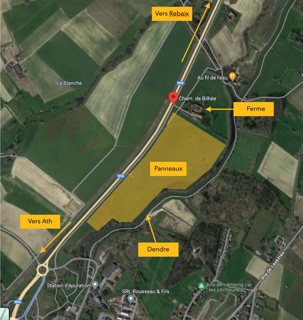 Un citoyen nous a alertés récemment concernant un projet agrivoltaïque à l’entrée de la ville d’Ath, capitale du Pays Vert, et précisément sur une des dernières prairies alluviales de la Vallée de la Dendre. Cette prairie permanente (jamais pulvérisée), située entre la nationale 56 et le canal de la Dendre, jouxte la Ferme de Tenre, ancienne abbaye qui fait partie du Patrimoine Monumental de Belgique. C’est à cet endroit que le propriétaire de la prairie (un baron), un intermédiaire monnayant l’accès à la profession d’agriculteur pour le compte du premier, le promoteur EtherEnergy et IDETA ont décidé de placer 22.000 panneaux photovoltaïques. Des moutons seront présents et permettent aux protagonistes d’appeler cela un projet AGRIVOLTAIQUE. L’activité agricole est bien entendu secondaire et ceci au bénéfice d’une extrême rentabilité économique.