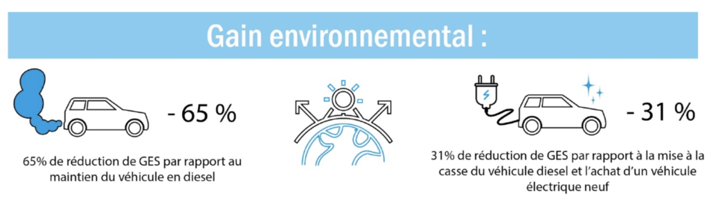 Gain environnemental du rétrofit électrique d’une citadine (infographie fournie avec la synthèse de l’étude). Télécharger l’infographie
