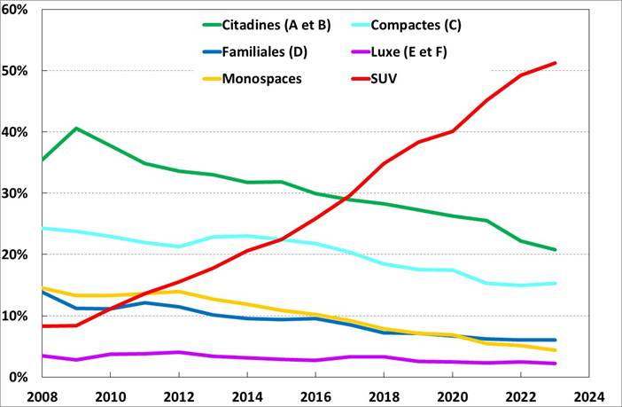 Nous avions hélas vu juste en qualifiant de « dingue » cette stratégie d’abandon des segments A (mini citadines : Fiat 500, Kia Picanto, …) et B (citadines polyvalentes : Renault Clio, Toyota Yaris …). L’évolution des ventes (figure 1) pourrait laisser penser que tout cela était raisonnable et que la demande s’oriente également vers les segments supérieurs. Mais les ventes reflètent l’évolution de l’offre : les automobilistes achètent « gros, suréquipé, puissant et cher » parce que les constructeurs leur disent de le faire à grand renfort de publicité et ne leur donnent que peu d’occasions d’acheter plus modeste …