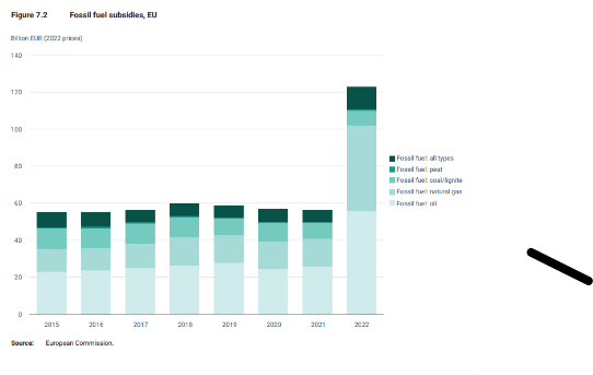 - Un étendard de la politique européenne a été le plan d’investissements post covid qui a libéré des milliards € d’argents parfois levés par l’Union elle-même (et non par les états) pour investir dans des infrastructures nécessaires à la transformation énergétique (rénovation, réseaux, productions industrielles… ). Cette logique d’investissements est nécessaire mais pas suffisante. Il faut, parallèlement, désinvestir de l’économie intensive en énergie et en substances polluantes. Exemple ci-dessous avec l’évolution des subventions au fossile qui a explosé.