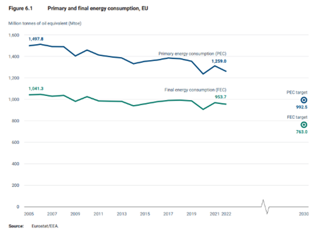 - Cette impression est renforcée si on regarde les « sous objectifs » censés participer à l’atteinte de l’objectif climatique dont : la réduction de nos consommations d’énergie (objectif d’efficacité énergétique) ou la part d’énergie renouvelable. La consommation d’énergie par exemple, diminue bien trop peu (voir graphe ci-dessous). Or l’Agence de l’environnement admet que l’UE déraille complètement de ce point de vue…
