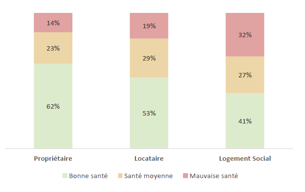 13% des Belges francophones ont actuellement, ou ont déjà eu un problème de santé lié à leur logement. Et ces problèmes dépendent fortement de la qualité du logement : lorsque le logement est très bon, la proportion tombe à 3%. Quand le logement est considéré comme très mauvais, le chiffre grimpe à 34%. Et c’est bien là que le bât blesse, puisque les personnes appartenant à des catégories socioéconomiques plus élevées ont plus souvent accès à des logements de meilleure qualité. De même, les propriétaires sont nettement plus nombreux à avoir un logement de bonne qualité que les locataires. Et donc, les propriétaires ont également, en moyenne, un meilleur état de santé.