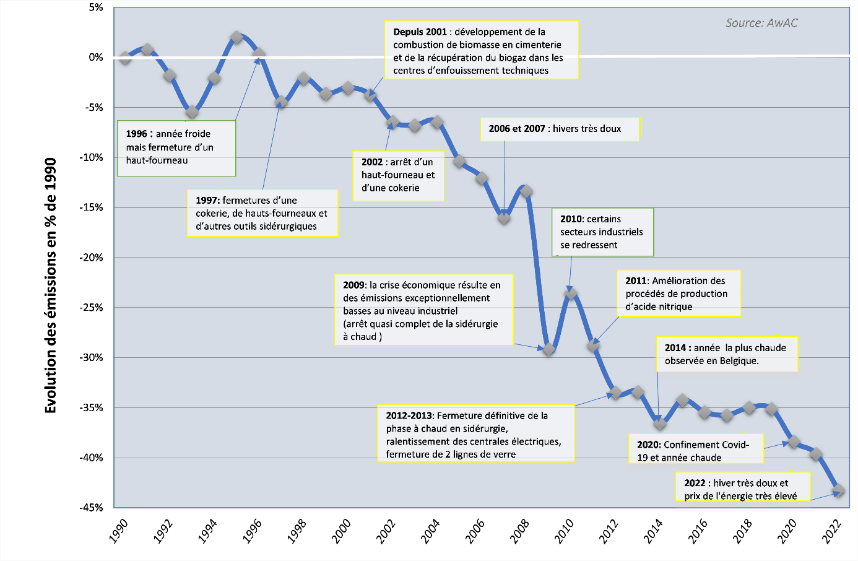 Graphe officiel de réduction des émissions de GES wallonnes. Qui illustre le lien avec l’histoire de la désindustrialisation (source AWAC)