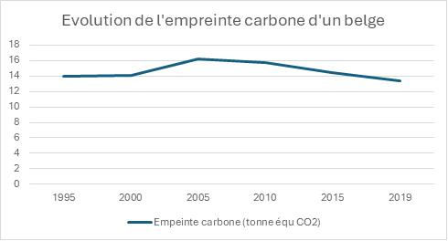 Un indicateur permet de regarder non seulement nos productions industrielles mais aussi les importations, c’est l’empreinte carbone. D’après les estimations du shift project, l’empreinte carbone du Belge est restée plus ou moins la même depuis les années 1990… Autour de 14 Tequ CO2 en 1995 contre 13,4 Tequ en 2019…. A la lecture de ce chiffre, on serait tenté de questionner le fait de savoir si nous vivons dans une société plus vertueuse au niveau du climat qu’il y a 30 ans…