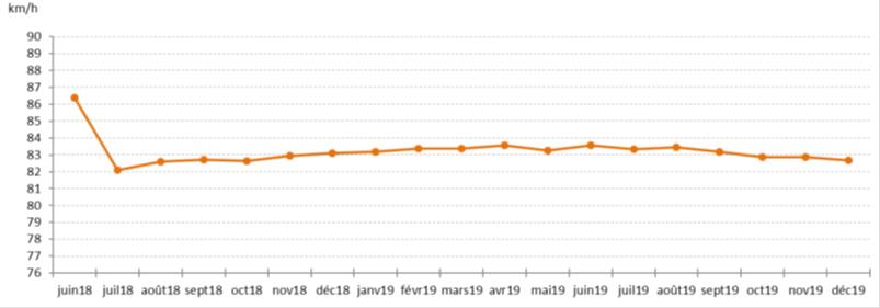 Figure 1 : Evolution des vitesses moyennes mensuelles de l’ensemble des véhicules de juin 2018 à décembre 2019 sur le réseau concerné – données de l’observatoire VMA80 (Source : Cerema)