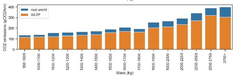 Le gap entre les émissions réelles (real-world sur le graphique ci-dessous) et officielles (WLTP sur le graphique), qui oscille entre 20 et 40 gCO2/km en moyenne pour les voitures essence et diesel, est 1,5 à 2,5 fois plus élevé pour les véhicules les plus lourds (SUV et voitures « haut de gamme » – luxury cars selon la terminologie de la Commission). Argument supplémentaire, si besoin était, justifiant notre plaidoyer LISA Car pour l’introduction de normes limitant la masse (ainsi que la puissance, la vitesse de pointe et l’agressivité de la face avant) des voitures.
