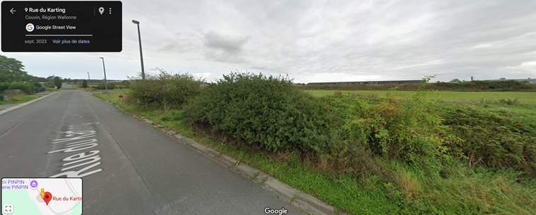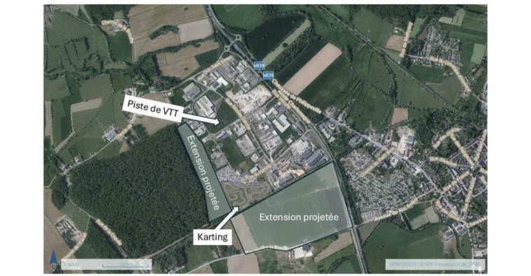 Partons d’abord à la découverte du zoning existant. La vue aérienne nous montre qu’il comprend une part importante d’espaces verts. En nous rendant sur place, nous constatons qu’il s’agit d’un mélange de pelouses tondues et de zones de friche, où la nature reprend peu à peu ses droits (herbes hautes et broussailles). Vue du sol, l’étendue de ces zones apparaît encore plus clairement. Les entreprises présentes dans le zoning seraient-elles particulièrement soucieuses de préserver la biodiversité ? Il n’en est rien ; en fait, le zoning est loin d’être pleinement occupé. Même si tous les terrains ont été vendus, certains sont clairement laissés à l’abandon depuis plusieurs années. En additionnant ces zones « vertes », on estime à environ 7 hectares la surface de terrains encore disponibles ! Par ailleurs, certains aménagements semblent un peu incongrus en zone d’activité économique industrielle : on y trouve notamment un terrain de karting et une piste de VTT privée. Si ces infrastructures font le loisir de certains, on imagine bien qu’elles ne pourraient trouver leur place à cet endroit si la demande des entreprises pour s’installer était trop pressante…